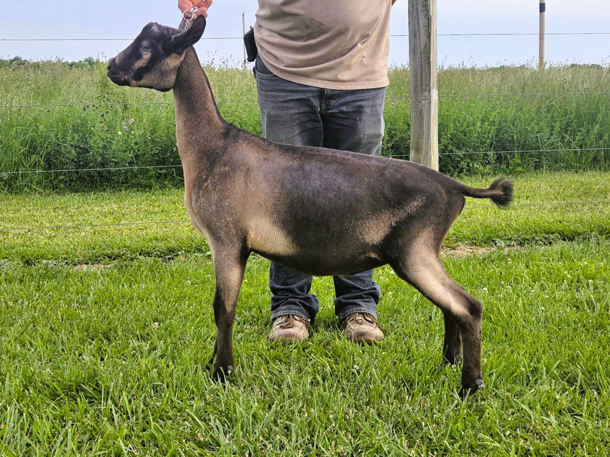 Hoosier Homestead Vic’s Kaiser is a beautiful early-February buck kid out of SGCH McCann-Farm HWK Kleopatra. Kleopatra was the 1st Place/1st Udder 3-year-old at the 2021 ADGA National Show, as well as the Champion Alpine Senior Doe at the 2021 Minnesota State Fair, and the All-American 3-Year-Old in the 2021 Alpine International All-American. She is a powerhouse doe with a final appraisal score of EX92 EEEE, but more importantly she has proven her value in her ability to reproduce herself well in her daughters, most recently with Haycreeks Outlaw Klover being the Recorded Grade Junior National Champion at the 2024 ADGA National Show, and multiple wins at state fairs between her daughters as well. Her progeny has performed well in sales receiving national attention, with her son Haycreeks MMK Kato earning the High Selling spot at the 2022 WDGA Fall Conference & Select Sale. Kleopatra’s sire, SG Kickapoo-Valley Proud Hawkeye, has a final appraisal of EX90 VEE, and a spot on the Elite Sire list. Last, but not least, Kleopatra isn’t just a pretty face, she puts her money where her milk is, with milk records over 4000 pounds.
