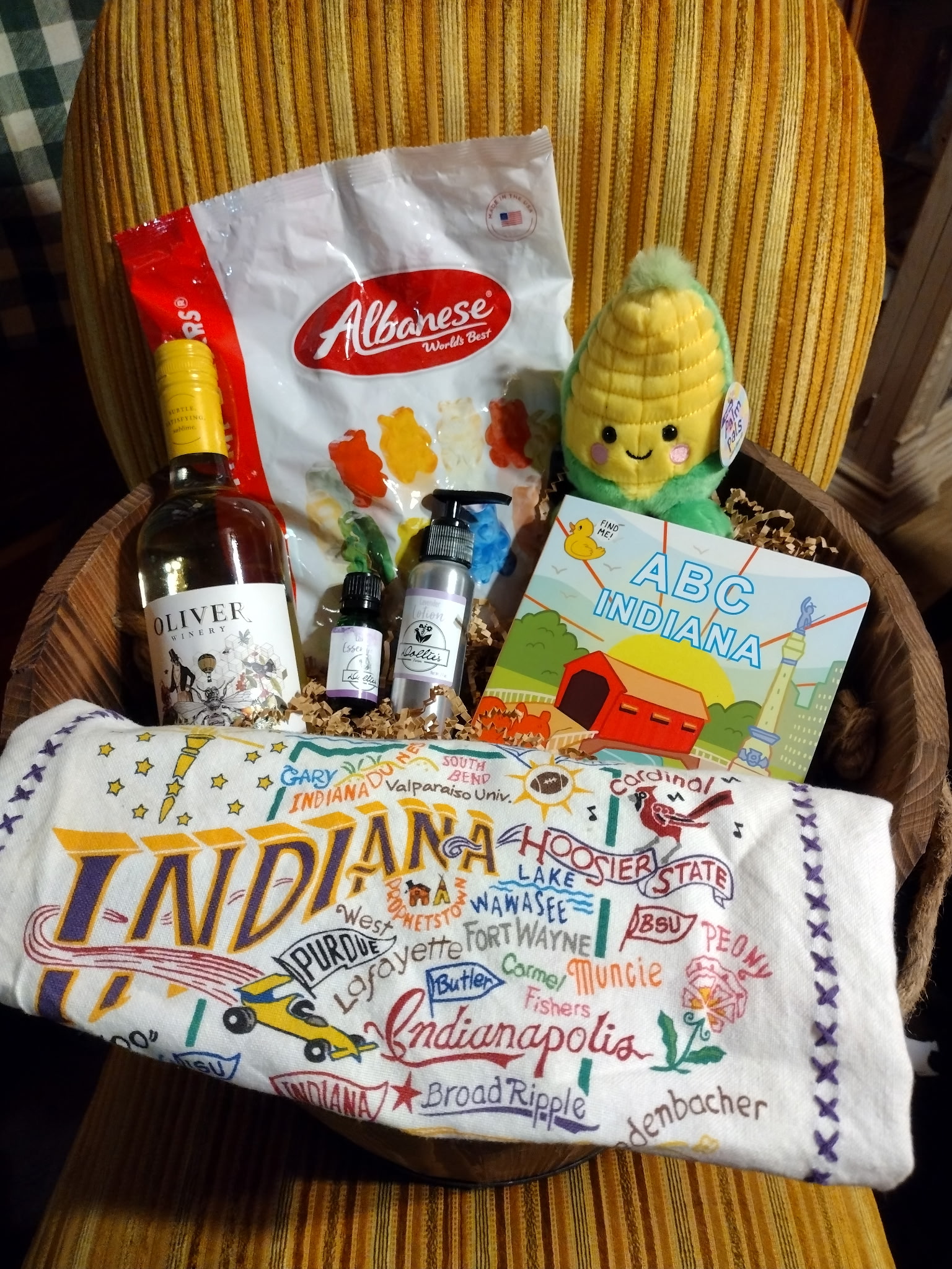 This basket features items from the state of Indiana. Plus, a milk machine pump is included with the basket. The pump is not included with the photo, but it will be included with the basket.