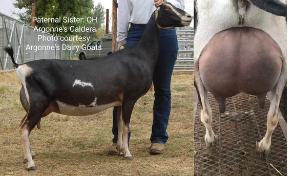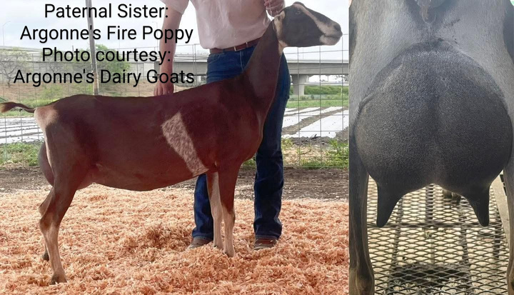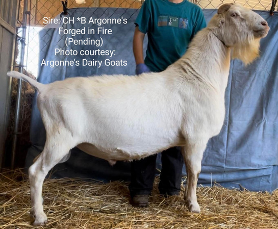 DIXIE combines not only some of my best genetics with her dam, KENZIE’S NSMR KALA—who just recently appraised VEEE VG89 as a FIRST freshening 2-year-old—but also some of Audrey Greenwood of Argonne’s Dairy Goats’ best, with DIXIE’s sire being CH ARGONNE’S FORGED IN FIRE (pending), a truly special proven sire with multiple finished daughters!