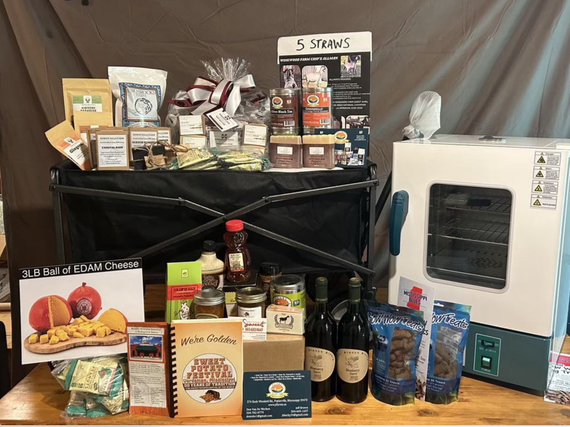 The Mississippi Harvest Basket is a showcase of Mississippi agricultural products and hand crafted items we know you’ll love! This includes Mississippi produced goats milk soaps, wine, roasted peanuts, teas, sweet potato marmalade, sweet potato jam, sweet potato cookbook, Edam cheese from MSU dairy, rice, seasoning, bbq sauce, and even dog treats. All produced or grown in the Magnolia State!
