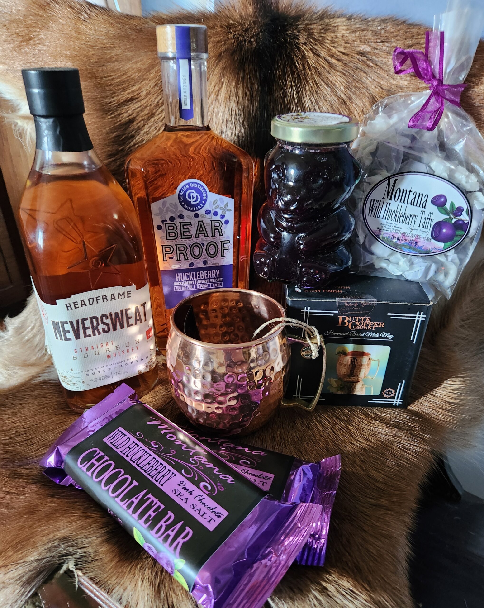 Montana basket includes: 2 Montana copper mule mugs from the Butte Copper company Huckleberry chocolate Huckleberry taffy Huckleberry jam Bear proof Huckleberry whiskey from Glacier Distilling Headframe burbon from Butte distillery Nigerian goat hide rug