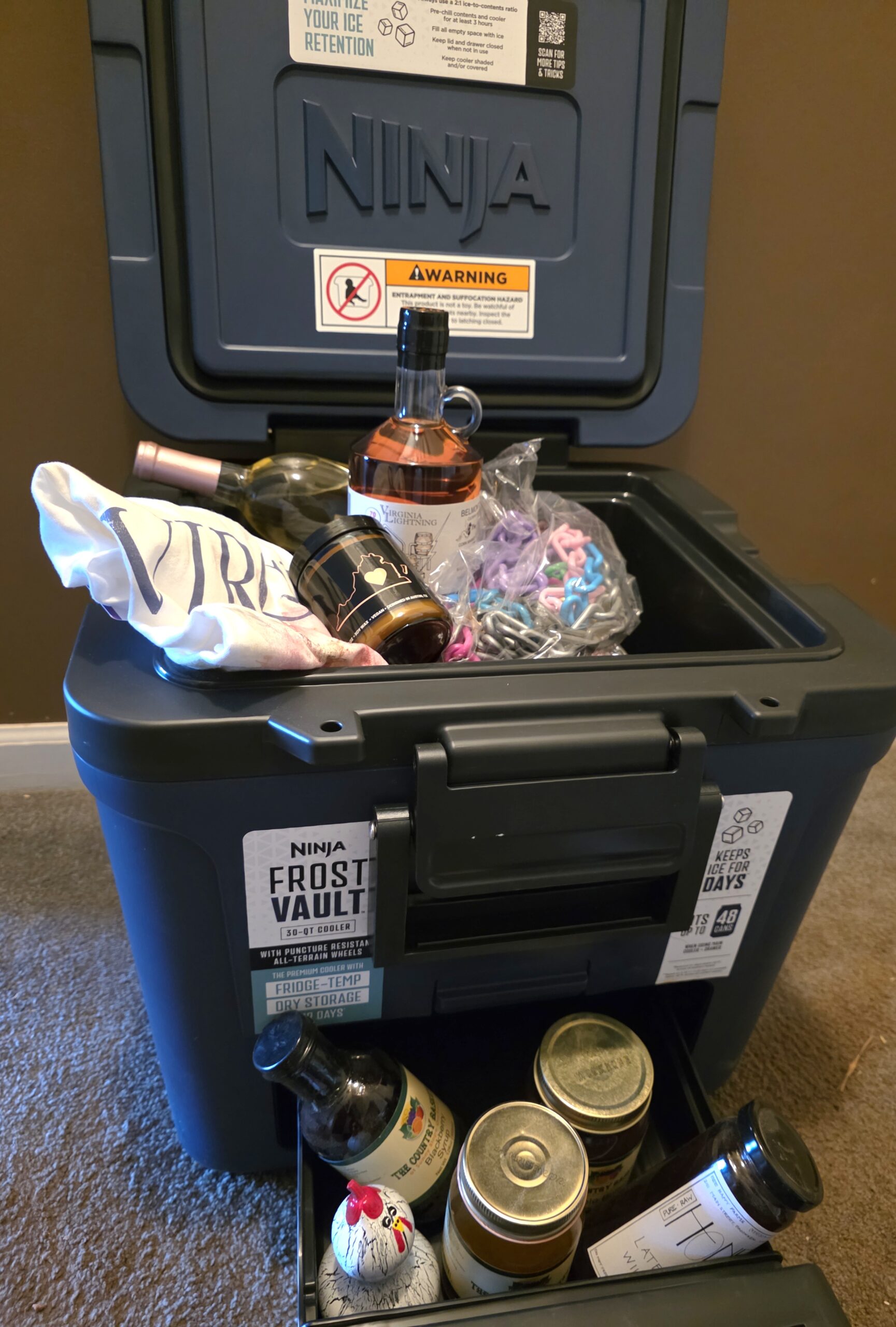 Wheeled 30qt Ninja Dry Vault cooler filled with Virginia items. Wine, moonshine, items from Virginia orchard, scented candles, plastic chain goat collars, and a Virginia t-shirt.